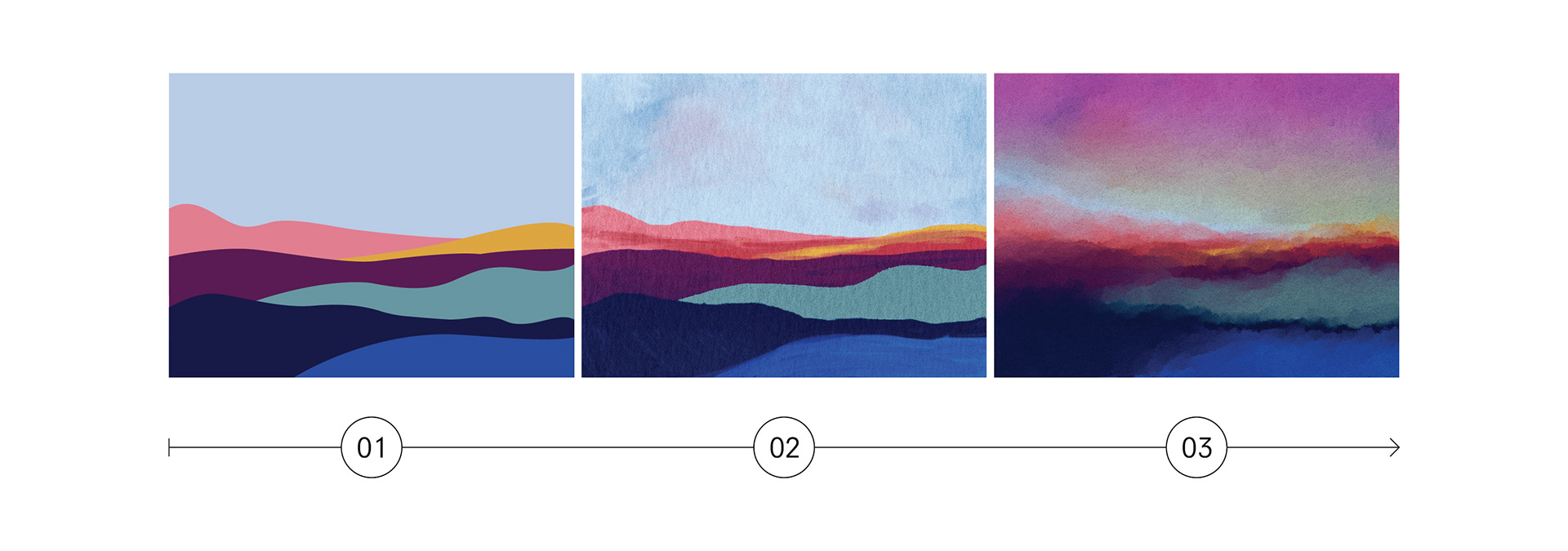 Illustrating a general landscape view in a multi layers color combination rooted from the main logo concept, depicting a dawn colors. The artwork treatment will be in an abstract painting style. Besides to represent a grande feels yet elegant, this visual also make the "elements" unite as one without borders, one unit as ASEAN. This painting style also represent the richness of Nusantara arts in general.