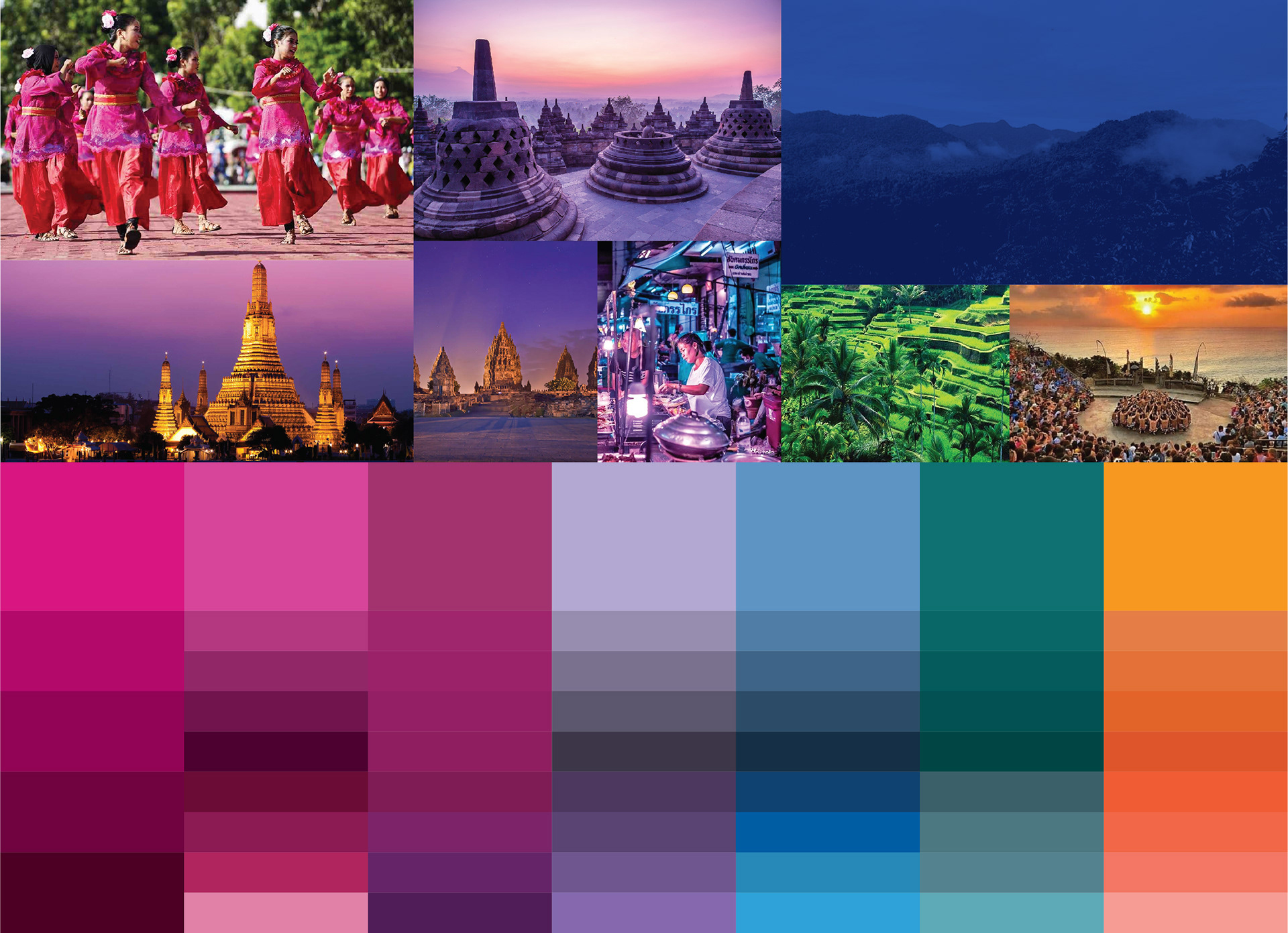 A combination of multi-layer colors, to represent diversity in the whole ASEAN countries. This is derived from the base color of pink, lavender, tranquil blue, verdigris green, orchid, and amber yellow. The spectrum can cover a range of ASEAN richness from the culture, peoples, arts, into the beauty of their landscape view.