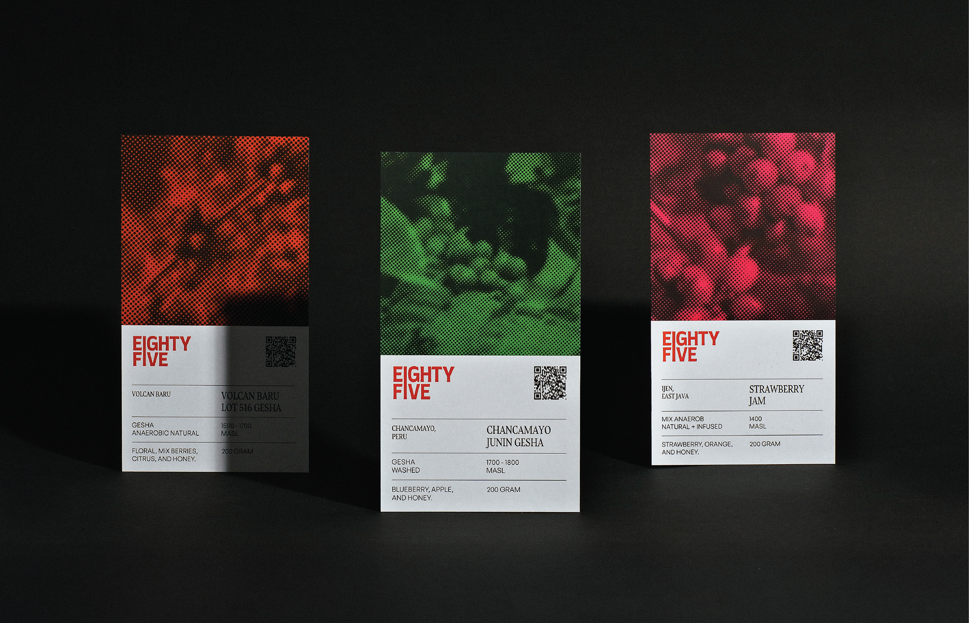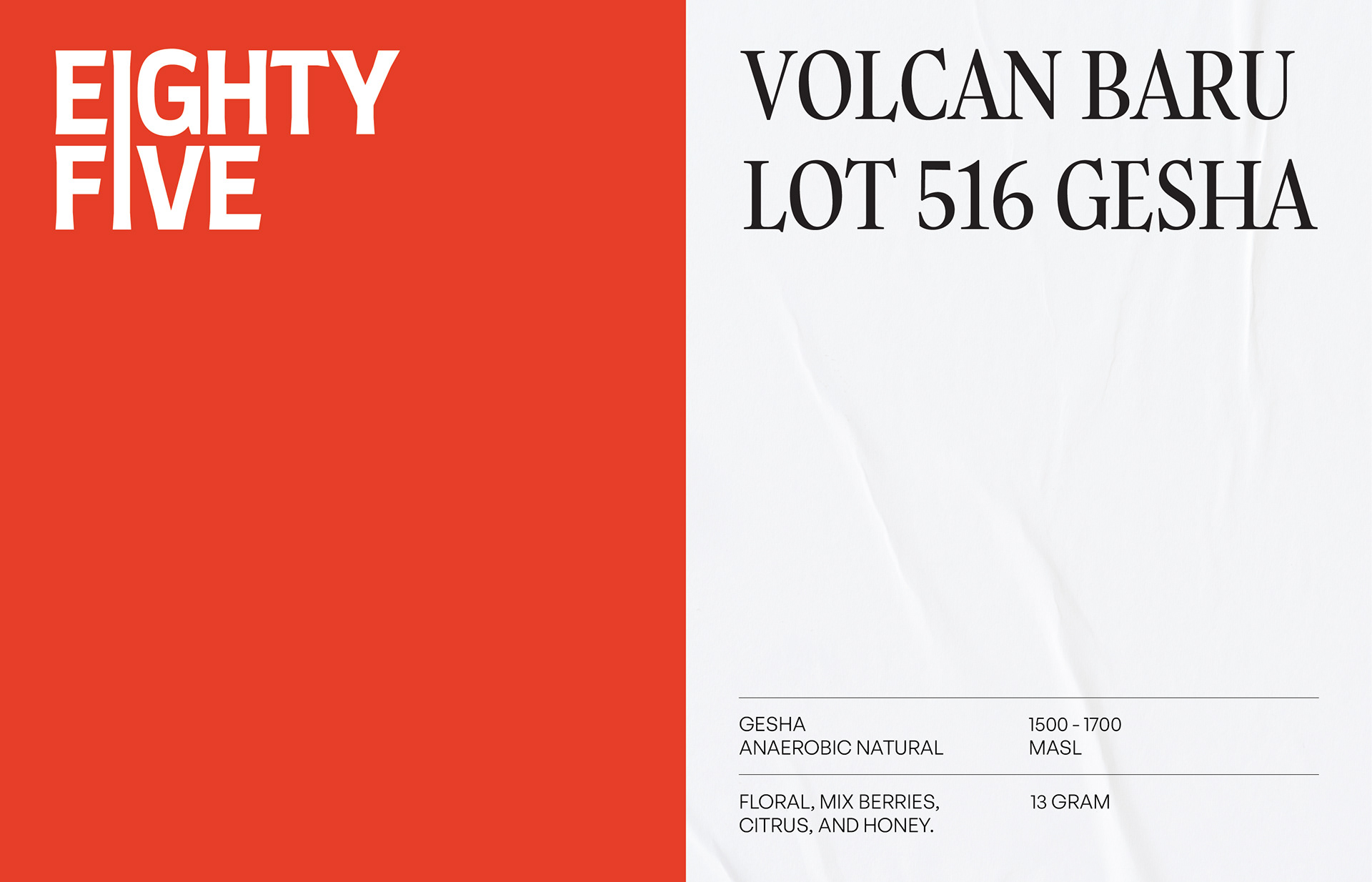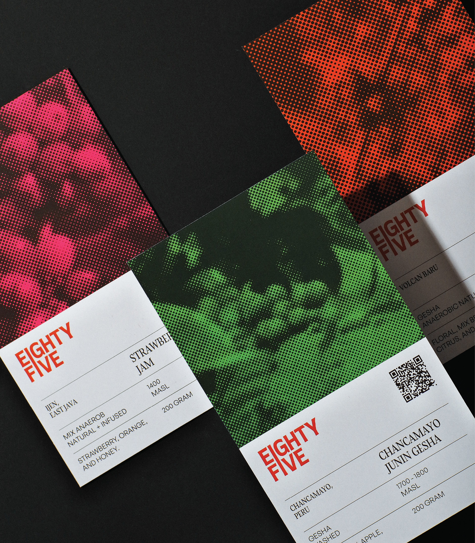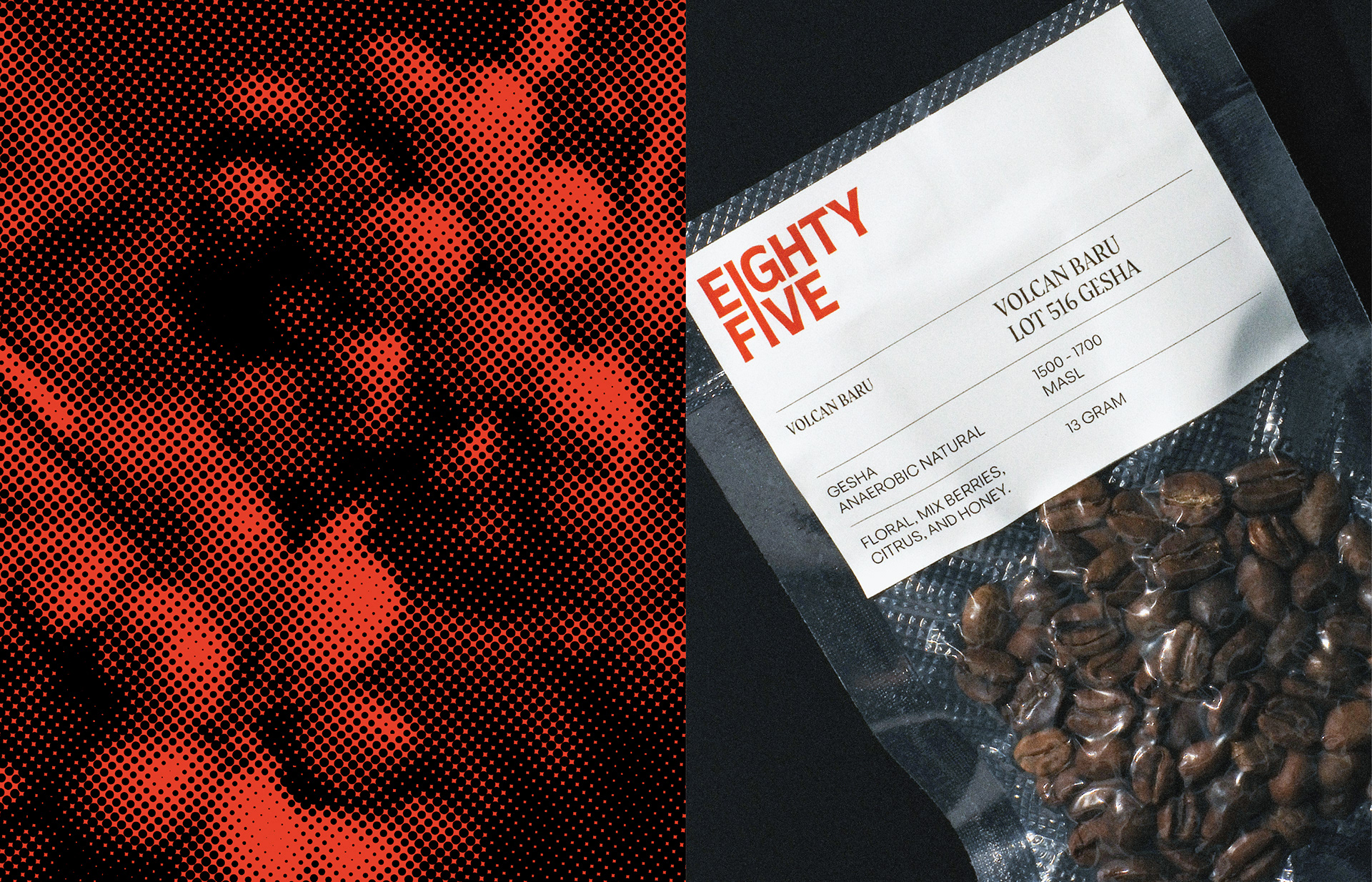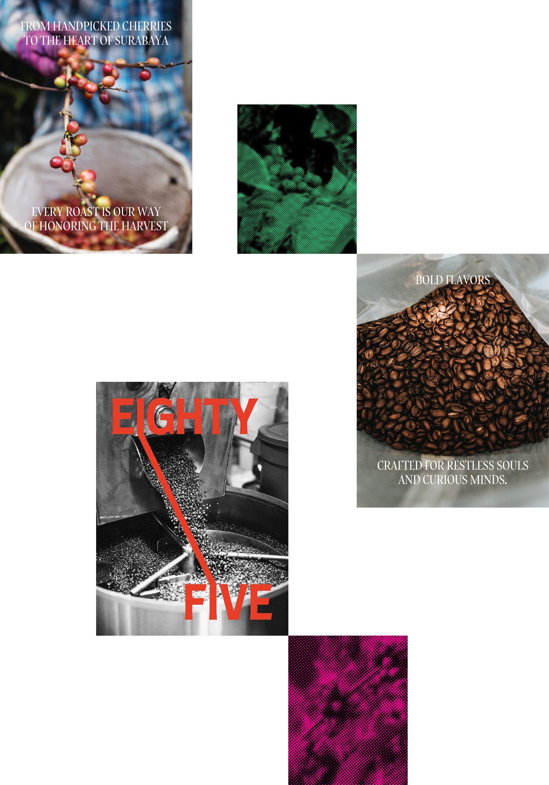 Visual identity designed for Eighty Five Roastery - Surabaya. This identity captures the interplay of heat, grain, and geometry. Each visual element mirrors the essence of coffee itself: raw yet refined, grounded yet expressive. Through deliberate restraint, the design finds beauty in contrast and rhythm in detail.